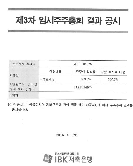제3차 임시주주총회 결과 공시 작성자: 관리자 작성시간: 2016-10-26 15:01 조회수: 1,084 . 공시.jpg (35 K) [664] 이전글 위험관리책임자선임공시 다음글 사외이사선임결의 목록