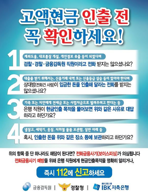 금융사기 예방진단표 작성자: 준법지원실 작성시간: 2016-03-31 14:39 조회수: 909 고액현금 인출 전 꼭 확인하세요!! 금융사기_예방진단표(2016.0330).jpg (184 K) [553] 이전글 '금융주소 한번에' 서비스, 금융회사 홈페이지를 통한 온라인 이용도 가능 다음글 불법대부광고에 사용된 전화번호는 1332에 신고하세요 목록