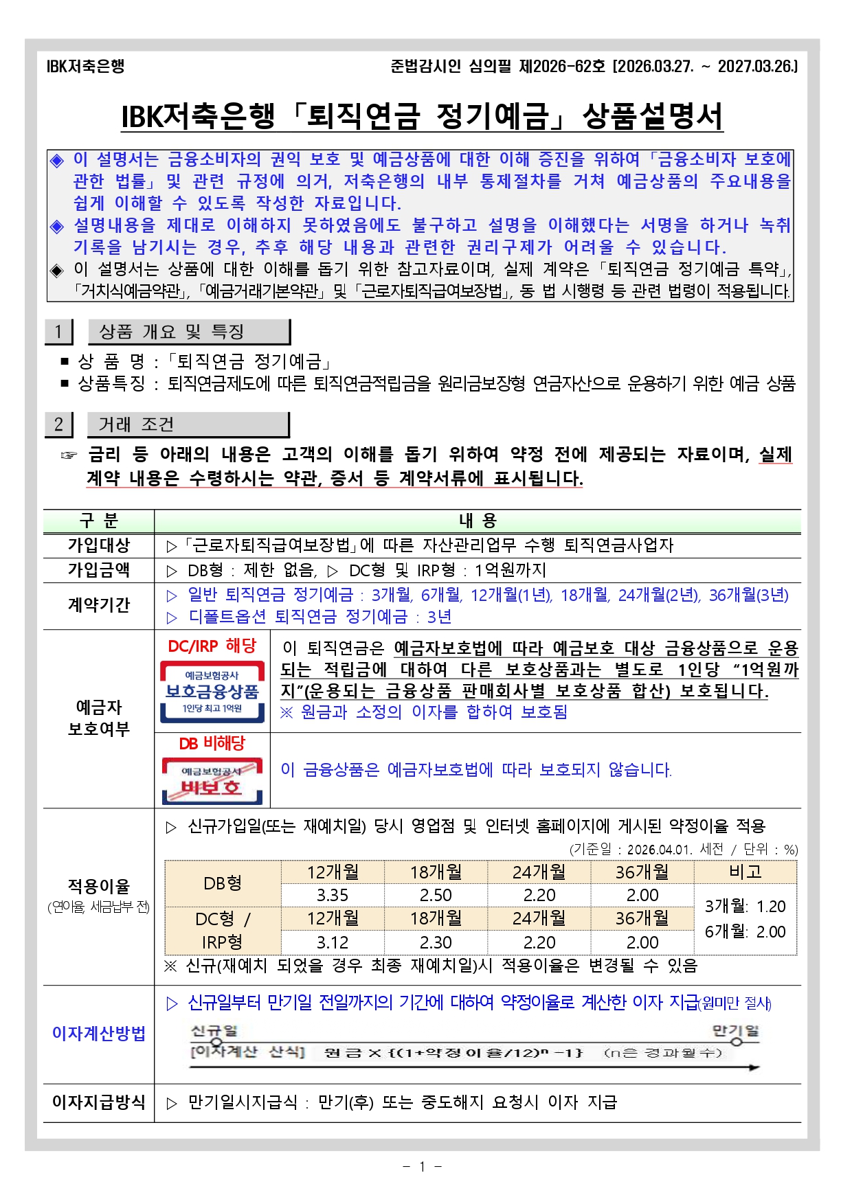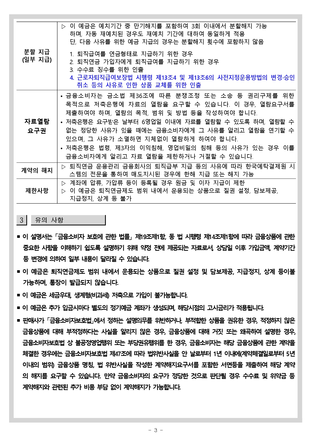 퇴직연금정기예금 상품설명서 작성자: 관리자 작성시간: 2019-07-02 16:43 조회수: 8,567 퇴직연금 정기예금 상품설명서_20260401시행.pdf (299 K) [28] 이전글 자유적립예금 상품설명서 다음글 ISA정기예금 상품설명서 목록