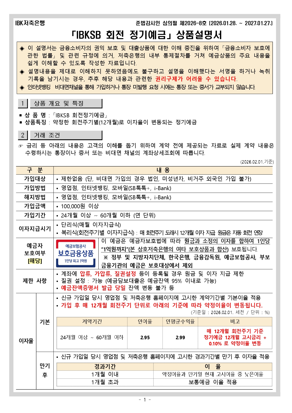IBKSB 회전정기예금(변동금리) 상품설명서 작성자: 관리자 작성시간: 2021-11-30 16:34 조회수: 7,959 회전정기예금상품설명서_20260201시행.pdf (294 K) [21] 이전글 IBKSB e-파킹통장 상품설명서 다음글 (판매중단) 참 든든한 기업저축통장 상품설명서 목록