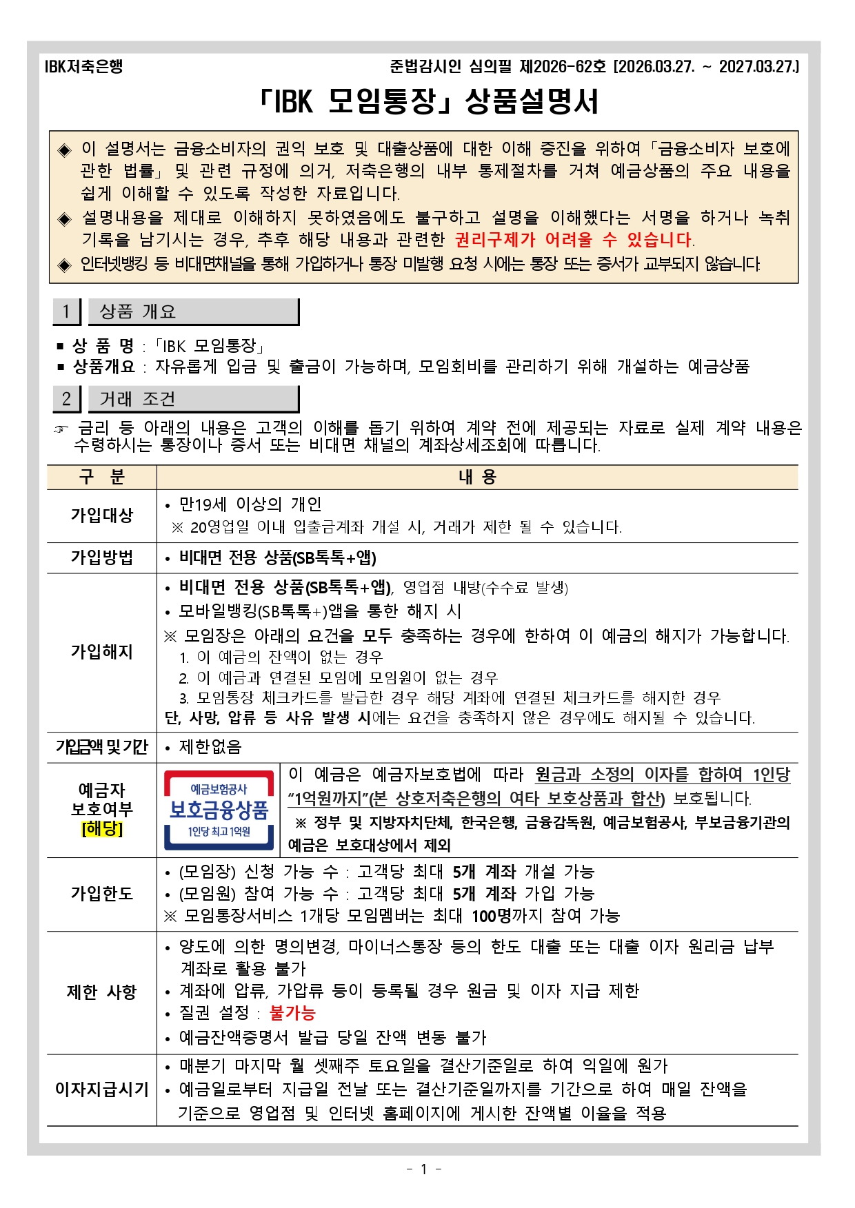 IBK 모임통장 상품설명서 작성자: 관리자 작성시간: 2025-10-28 17:53 조회수: 506 IBK모임통장 상품설명서_20260401시행.pdf (160 K) [4] 이전글 사랑愛 얼라 정기적금 다음글 IBK 미성년자통장 상품설명서 목록