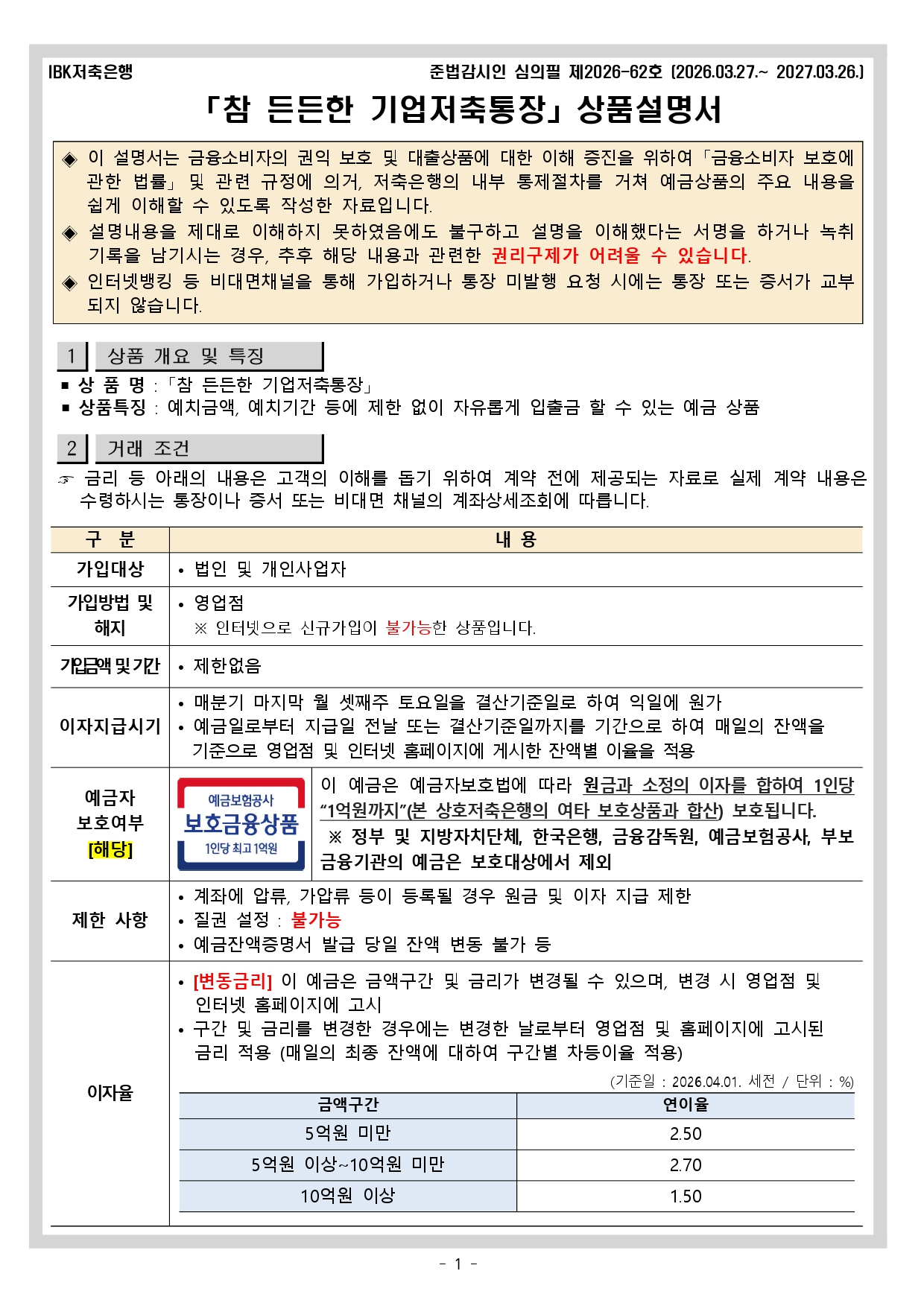(판매중단) 참 든든한 기업저축통장 상품설명서 작성자: 관리자 작성시간: 2023-07-25 17:28 조회수: 6,195 참든든한 기업저축통장 상품설명서_20260401시행.pdf (145 K) [1] 이전글 IBKSB 회전정기예금(변동금리) 상품설명서 다음글 (판매중단) 이어드림(Year Dream) 회전 정기예금 상품설명서 목록