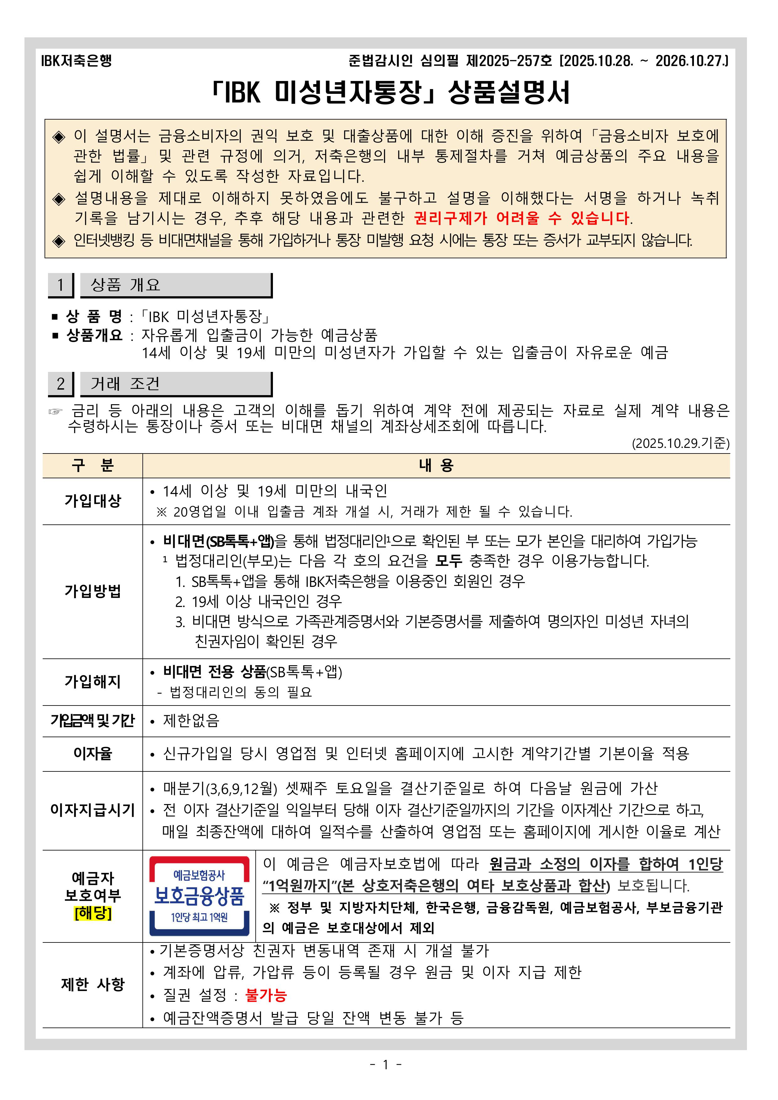 IBK 미성년자통장 상품설명서 작성자: 관리자 작성시간: 2025-10-28 17:53 조회수: 15 미성년자 통장 상품설명서_20251029시행_v2.pdf (150 K) [6] 이전글 IBK 모임통장 상품설명서 다음글 IBK 비대면 기업통장 상품설명서 목록