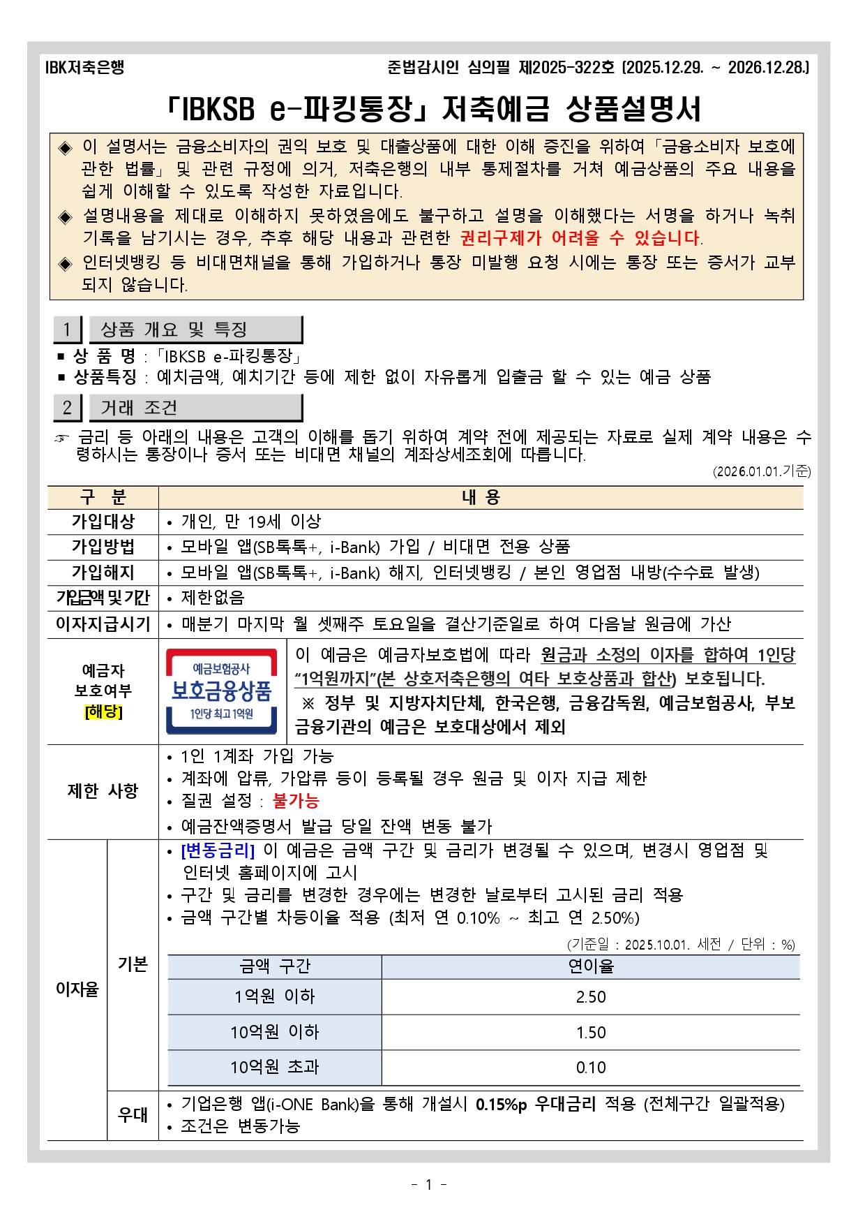 IBKSB e-파킹통장 상품설명서 작성자: 관리자 작성시간: 2021-05-31 22:34 조회수: 8,693 IBKSB e-파킹통장 상품설명서_20260101시행.pdf (149 K) [127] 이전글 (판매중단) 기업자유예금 상품설명서 다음글 IBKSB 회전정기예금(변동금리) 상품설명서 목록